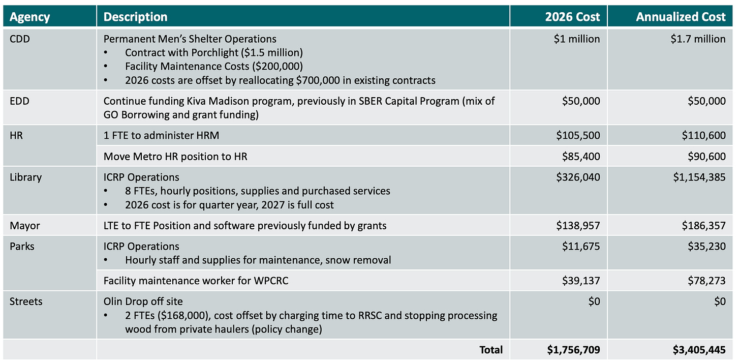 Budget-wise, the past 16 years have been very, very challenging, including an unprecedented referendum to raise property taxes. The 2026 budget also promises to be challenging because of the State Expenditure Restraint Program. We won’t get the official limits for another few days, but City finance staff projects that Madison’s “cost to continue” budget is only $1.6M under the overall limit of what we can spend in 2026. The “cost to continue” budget assumes we do nothing new in 2026, which means the “cost to continue” budget doesn’t fund fully staffing the new homeless shelter, or staffing the new library, both of which are under construction and will be completed later in 2026. The full list of “supplementals” is $1.7M in 2026, and that’s before any alders or the Mayor present their own new ideas.